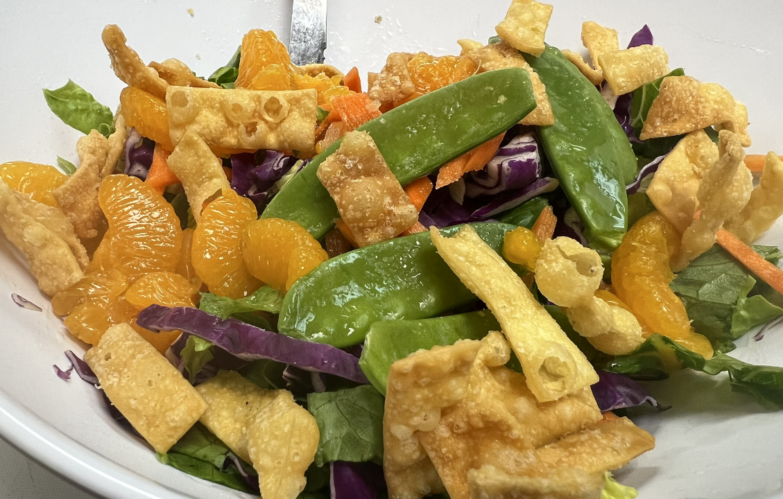 Romine, carrots, red cabbage, bean sprouts, mandarin oranges, wontons, and our sweet & savory sesame dressing (top with a protein at extra pricing; dressing & mandarin orange are on the side for salads to-go)