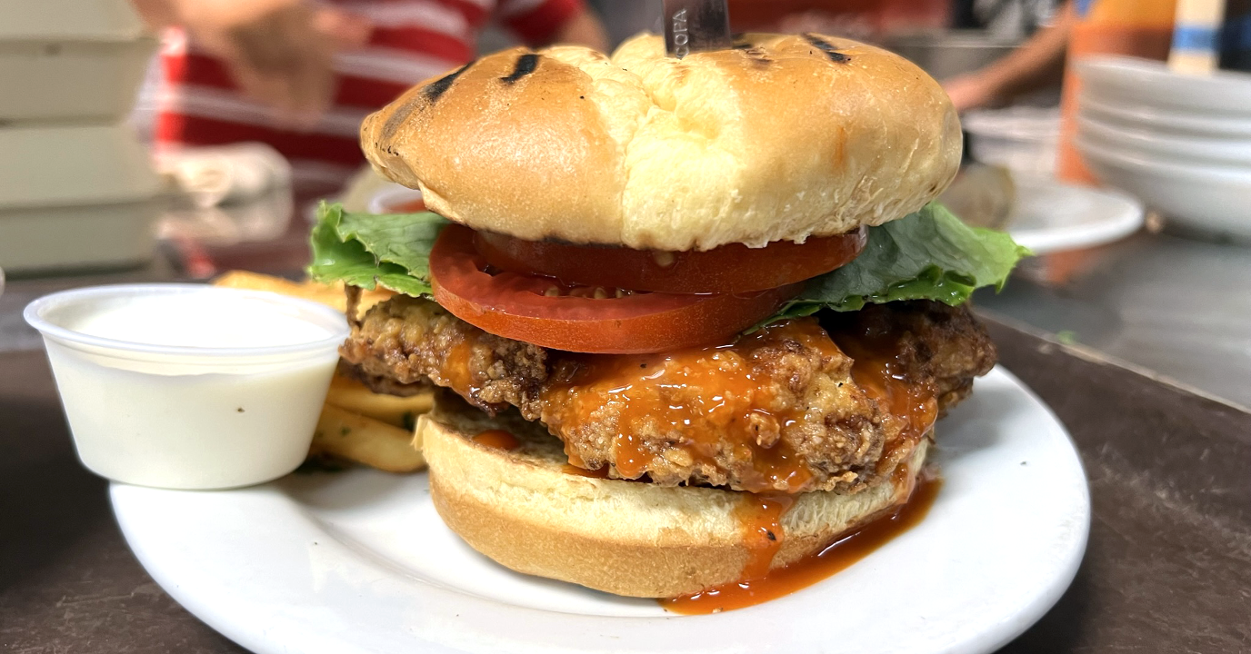 Breaded and fried chicken breast tossed in buffalo sauce, served with lettuce, tomato and bleu cheese on soft roll, choose a side dish