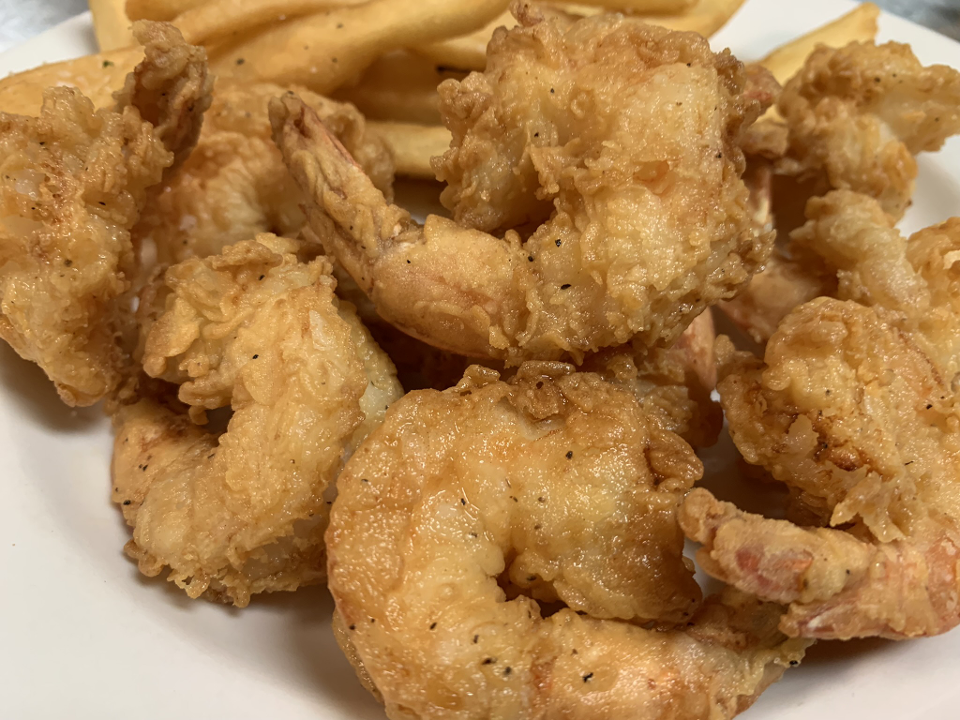 Freshly breaded medium white shrimp, fried golden brown, served with cocktail sauce, side dish, and cole slaw