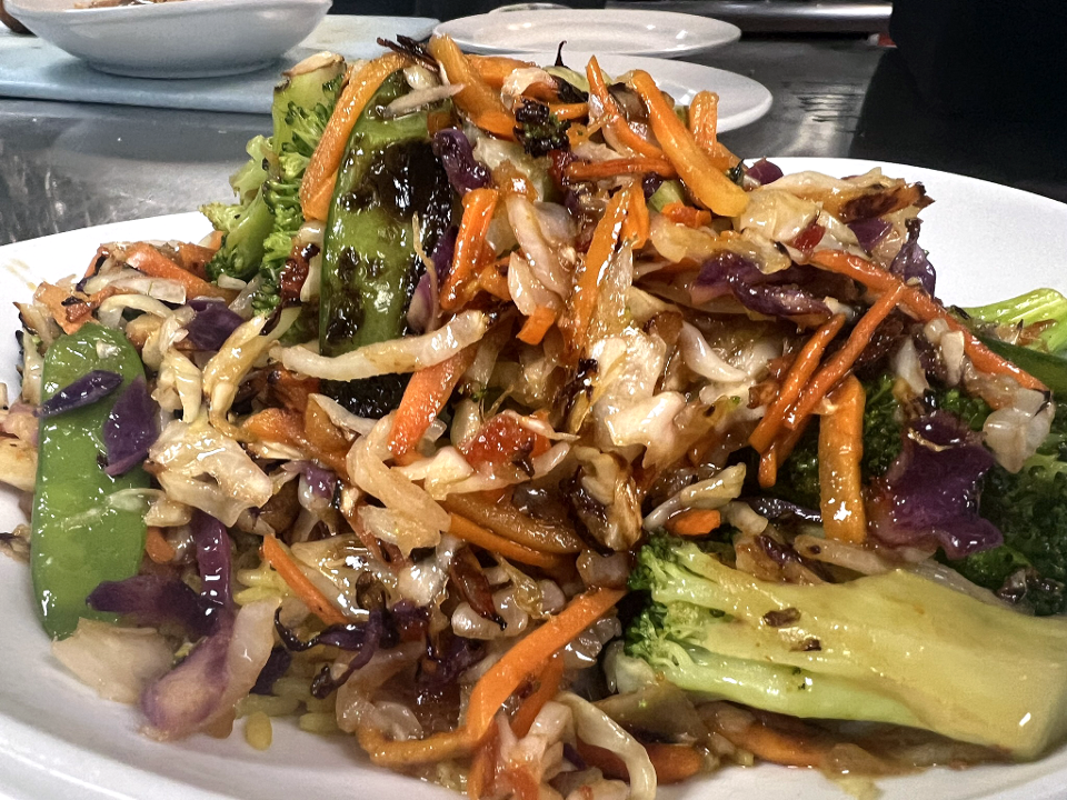 Stir-fried broccoli, bean sprouts, carrots, red & green cabbage, and sweet-chili sauce on a bed of vegetable rice, contains sesame seeds