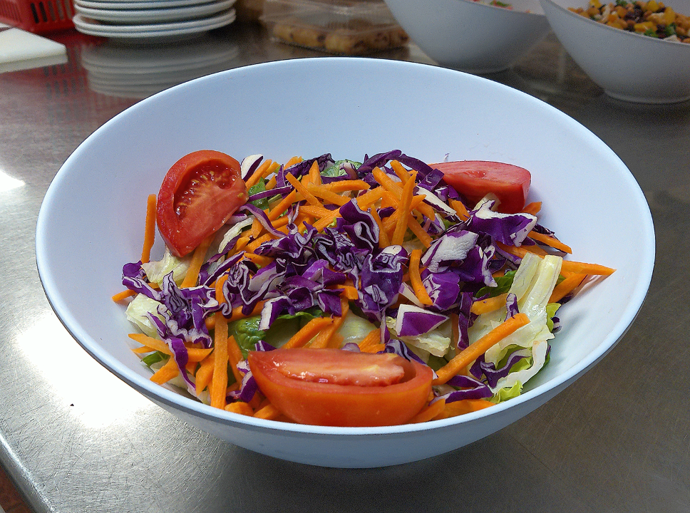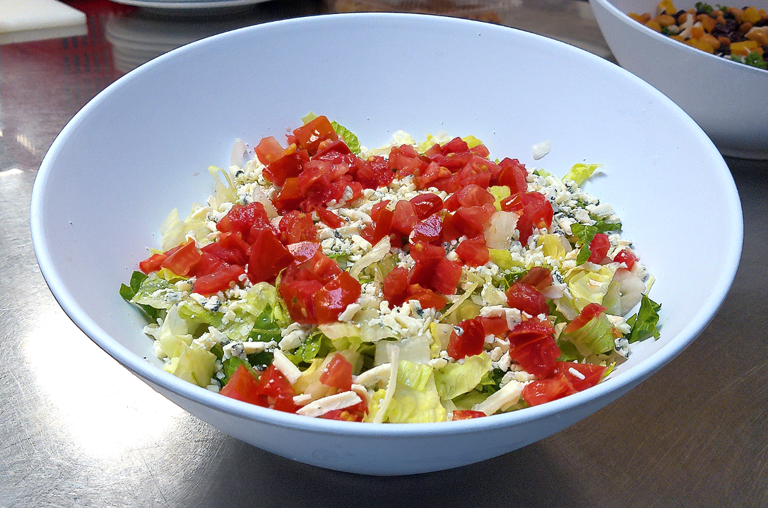 Chopped Romaine and Iceberg lettuce with ripe tomato wedges, shredded red cabbage & carrots, and your choice of dressing (dressing will be on the side for salads to-go)