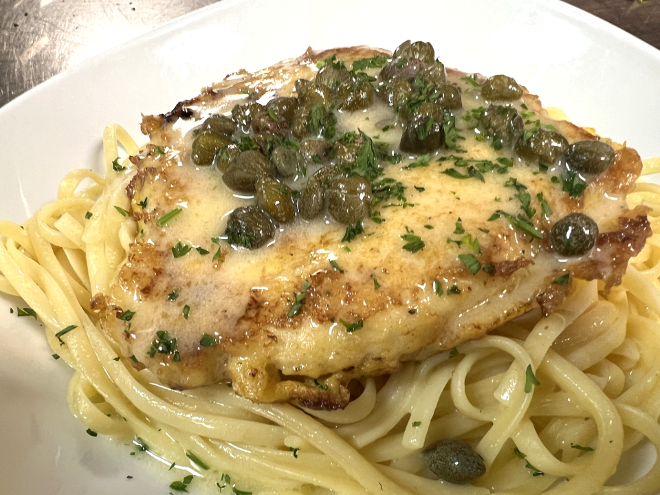 Sauteed egg-battered chicken breast with lemon-butter and capers on linguine and with choice of salad.