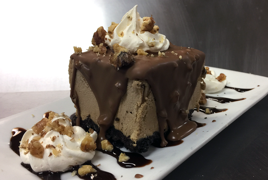Coffee ice cream in an Oreo cookie crust topped with a hard chocolate shell, nuts, and whipped topping