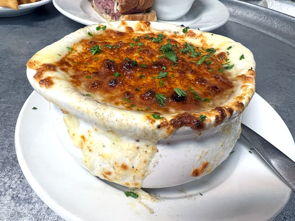 Loads of sauteed onions with beef and chicken stock, sherry, herbs and spice. The soup is topped with three melted cheeses (soup to-go has the cheeses on the bottom of the bowl)
