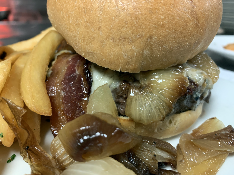 Grilled half-pound Angus burger with melted Gorgonzola cheese, sauteed onions, bacon, lettuce, tomato and choice of side dish.