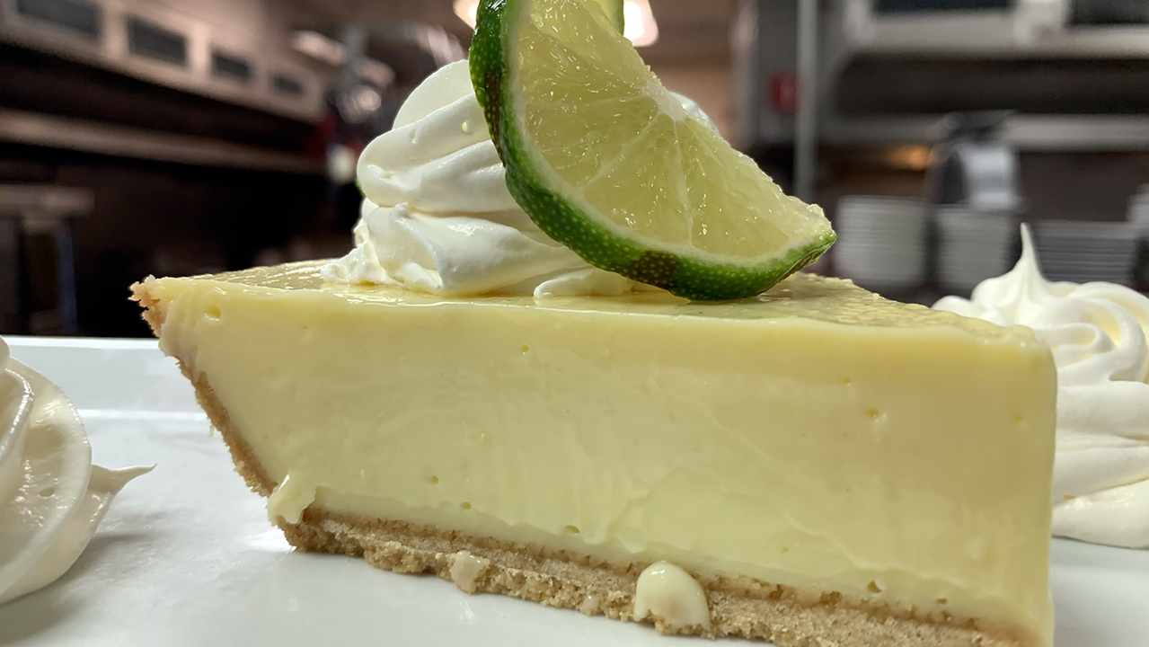 Cool and refreshing, we bake a graham cracker crust with a sweet and tangy key lime filling, garnished with whipped topping