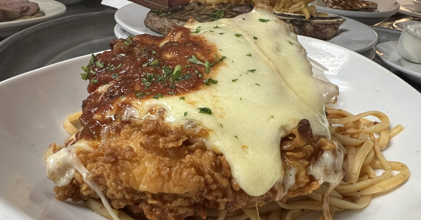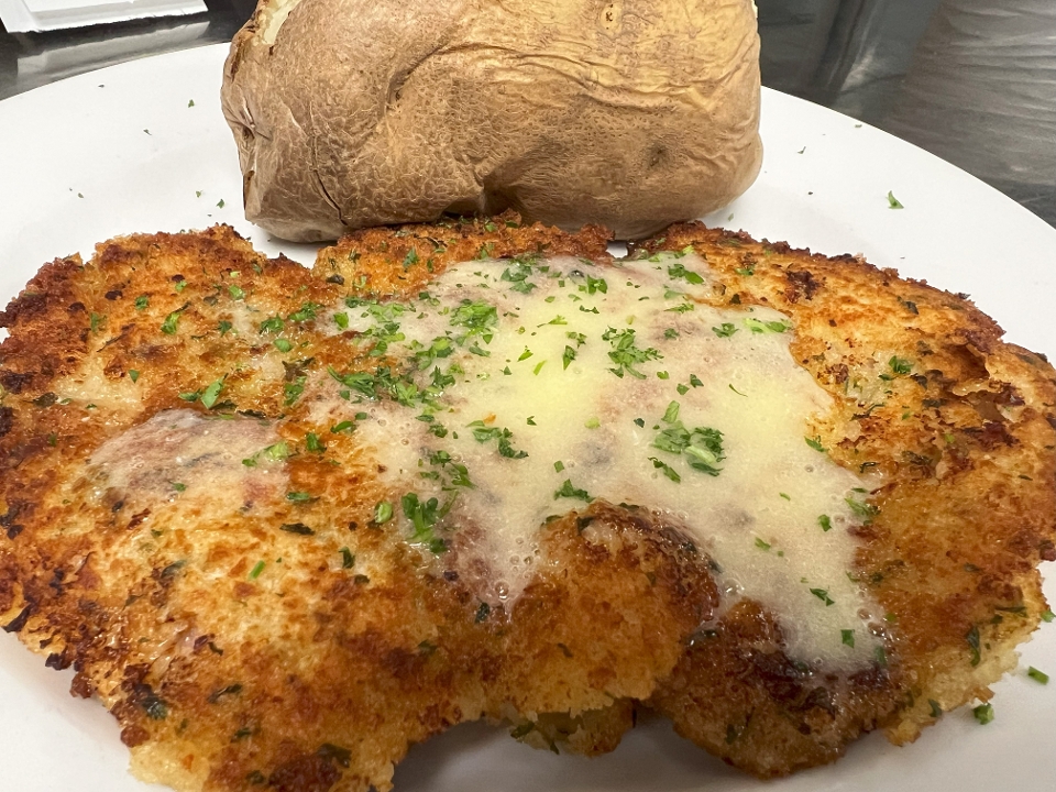 Fried, marinated chicken breast, baked in the oven with house marinara and provolone cheese, served on linguine (or other side dish)