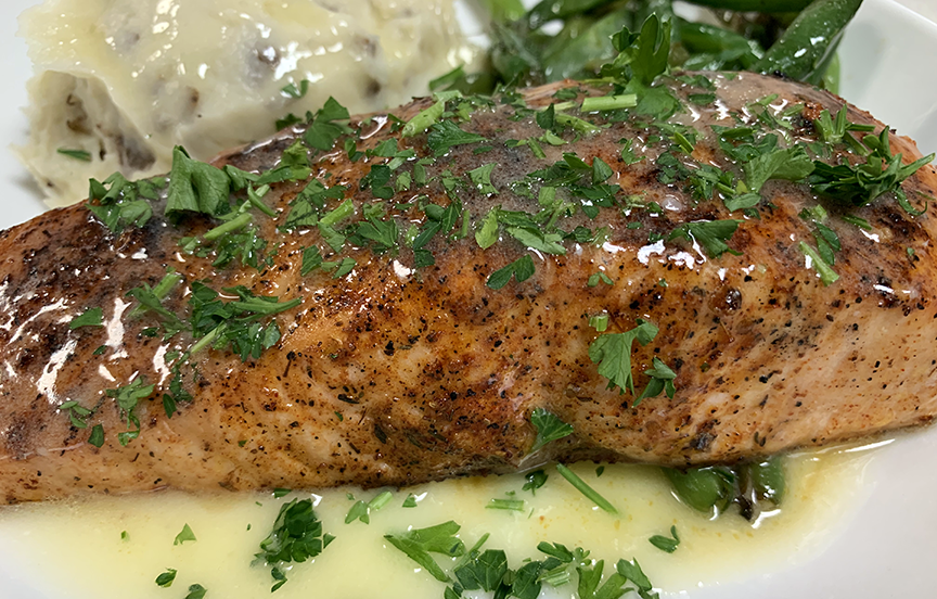Broiled North Atlantic Salmon with lemon-butter sauce, choice of side dish and choice of salad