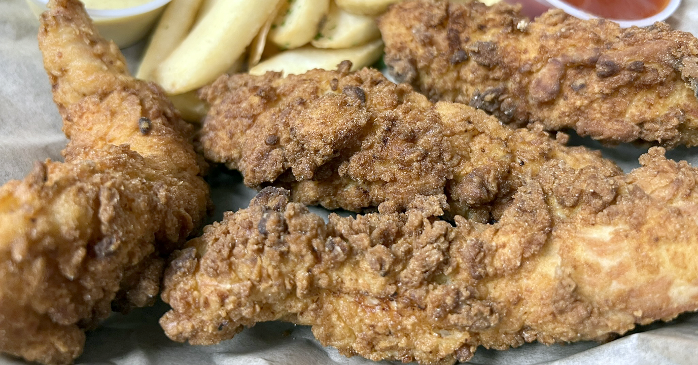 Battered with ordered, golden fried chicken tenderloin pieces, with side dish and honey-mustard sauce