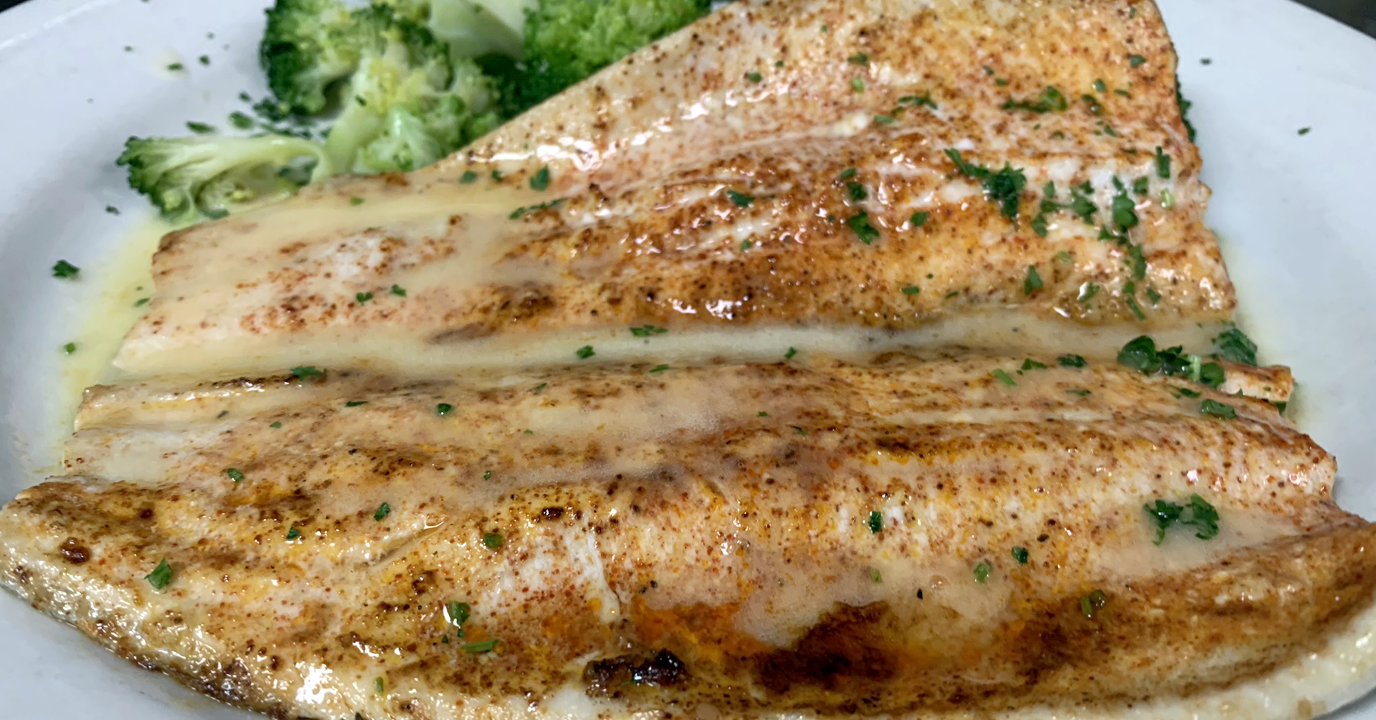 Butterflied trout, seasoned and broiled, finished with light lemon-butter, served with a side dish and salad