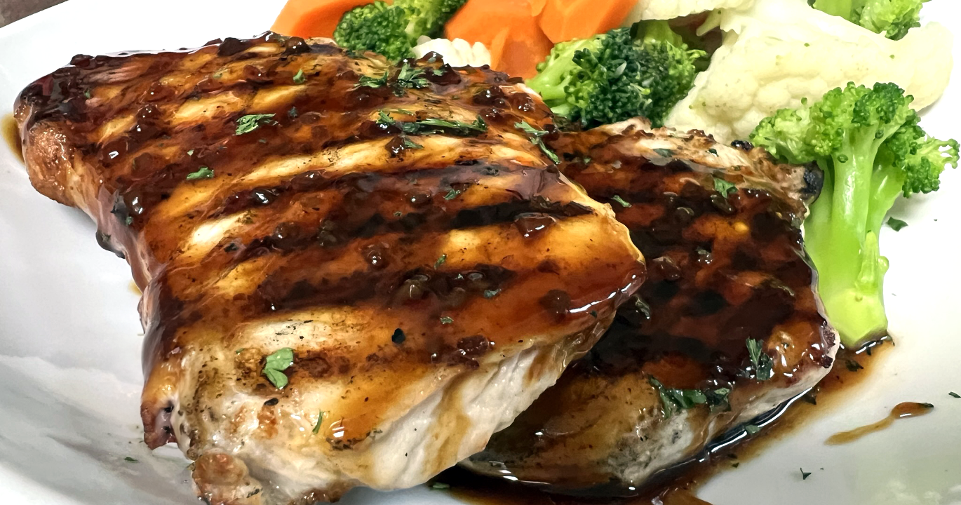 Twin grilled pork chops in our bourbon glaze with side dish and salad