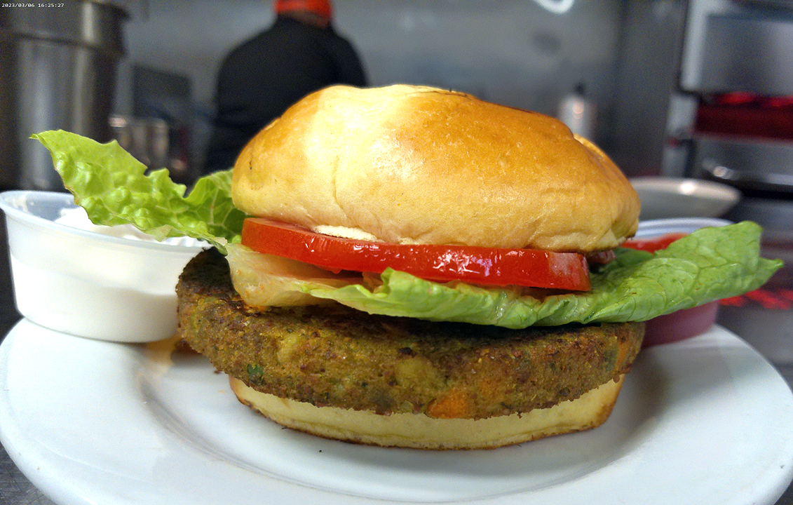Dr Praegar's Veggie Burger, grilled and topped with lettuce and tomato on soft bun, served with side dish and vegan mayo