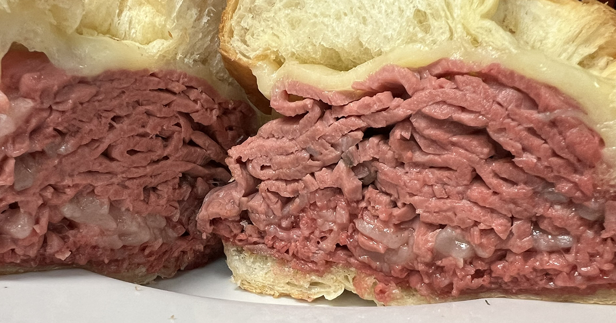 Thinly sliced prime rib on toasted croissant with Provolone cheese, served with au jus, horseradish sauce and side dish (when rare is ordered, the rarest possible prime rib will be used)