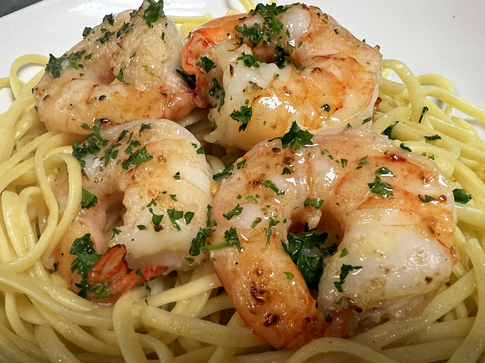 Large shrimp sauteed in garlic, white wine, butter and seasoning, served in a bed of linguine and with a salad