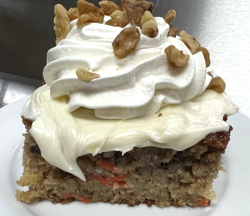 Made here from scratch with too many ingredients to list, moist carrot cake is topped with cream cheese icing - contains walnuts, pineapple, carrots, and flour, among other ingredients
