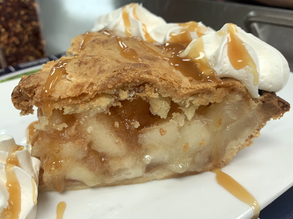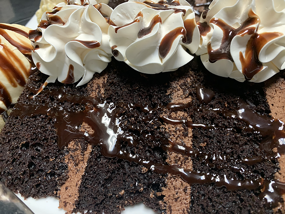 Made in-house, three layers of moist chocolate cake with fudgy chocolate icing, garnished with chocolate sauce and whipped topping