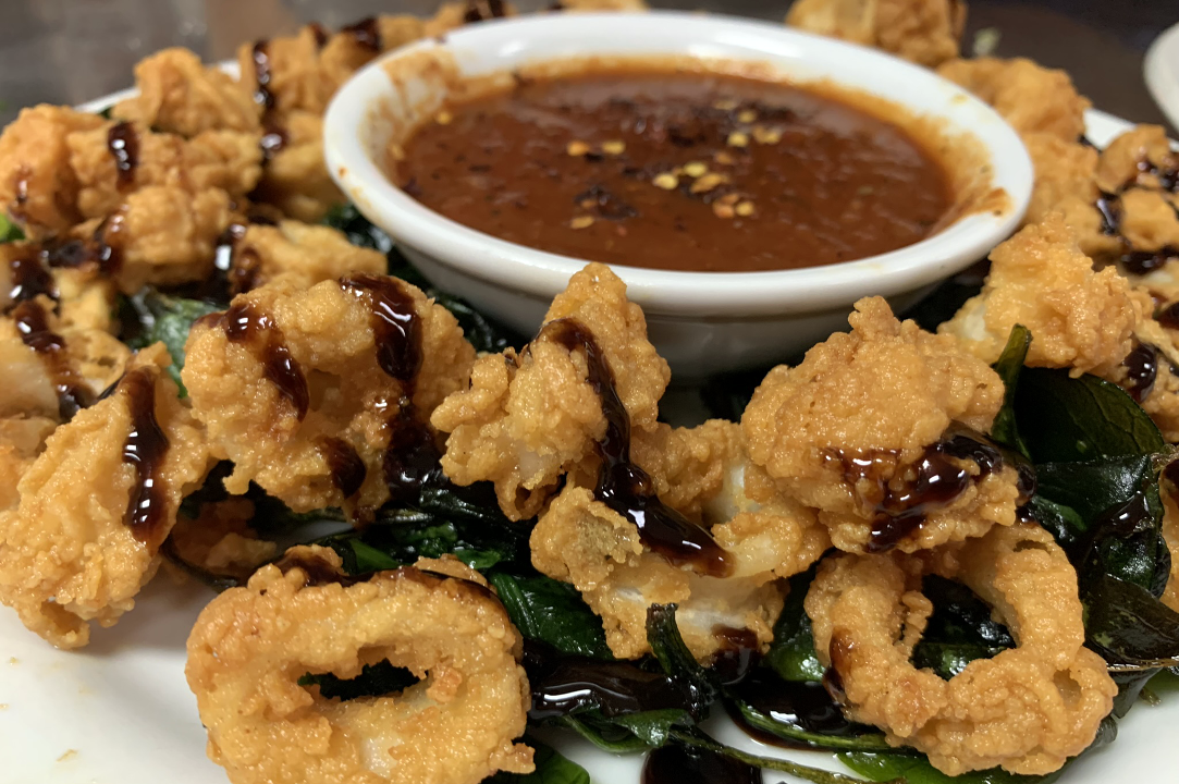 Battered and fried when ordered, tubes-only calamari is delicious, served with house marinara and balsamic glaze on the side.