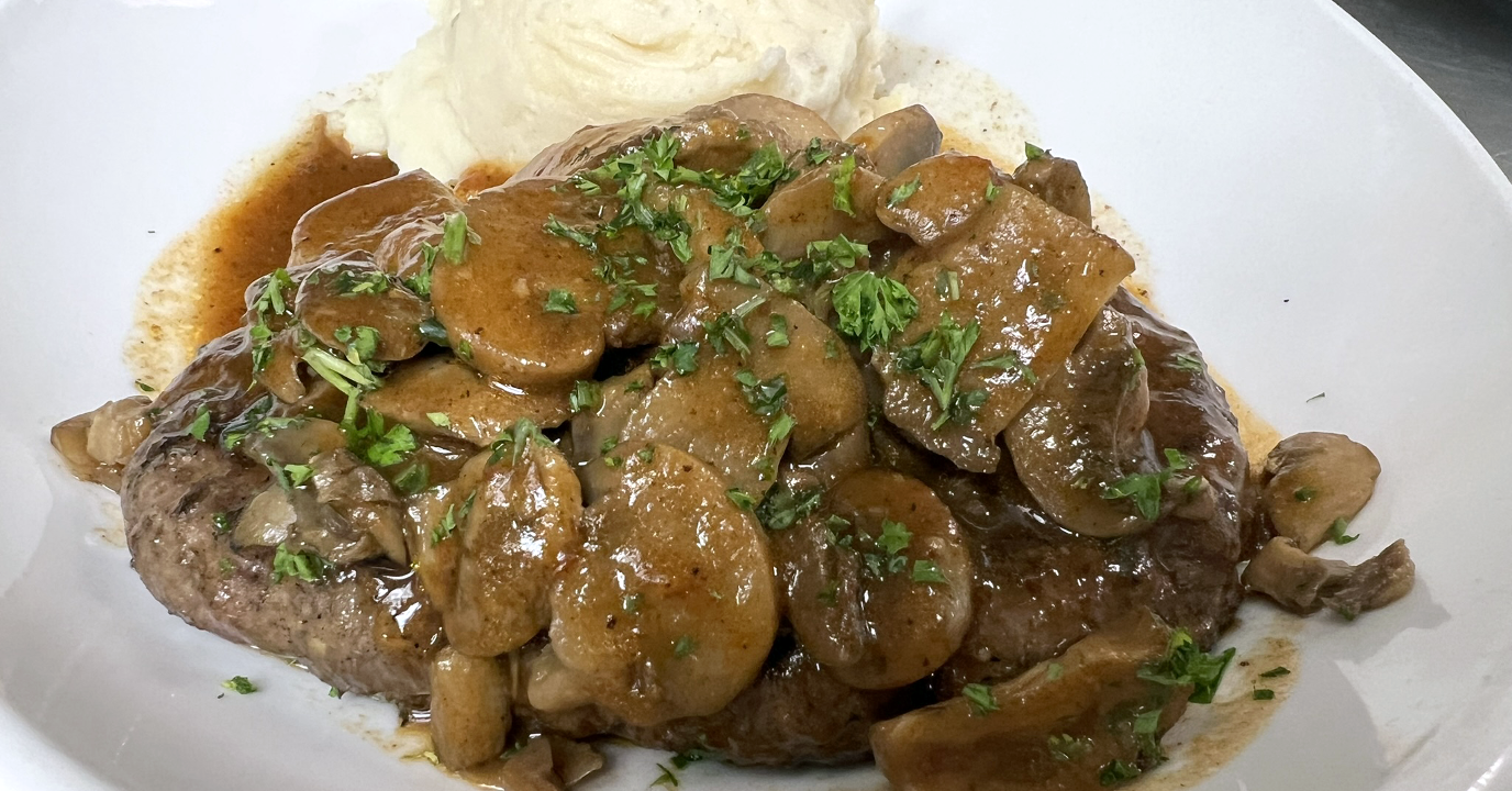 Grilled Angus ground sirloin topped with sauteed mushrooms and demi-glace, served with side dish and salad