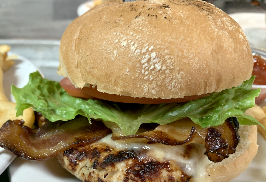 Grilled marinated chicken breast, with Swiss cheese, two bacon strips, honey-mustard, lettuce, tomato and choice of side dish.