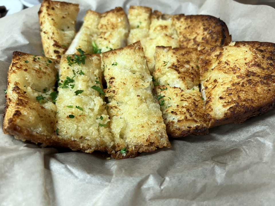 Hand-dipped in butter, oil, and lots of freshly ground garlic, bread is from a local bakery, toasted in our oven