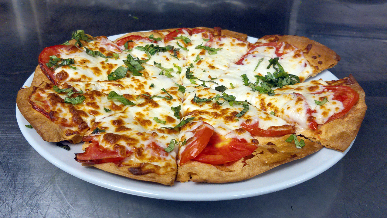Crisp, thin pizza crust, fresh sliced tomatoes, shredded mozzarella cheese, olive oil, and fresh basil