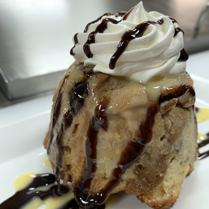 Baked by our baker, bread, eggs, sugar, vanilla, and chocolate chips in a large ramekin, served with chocolate sauce and creme anglais