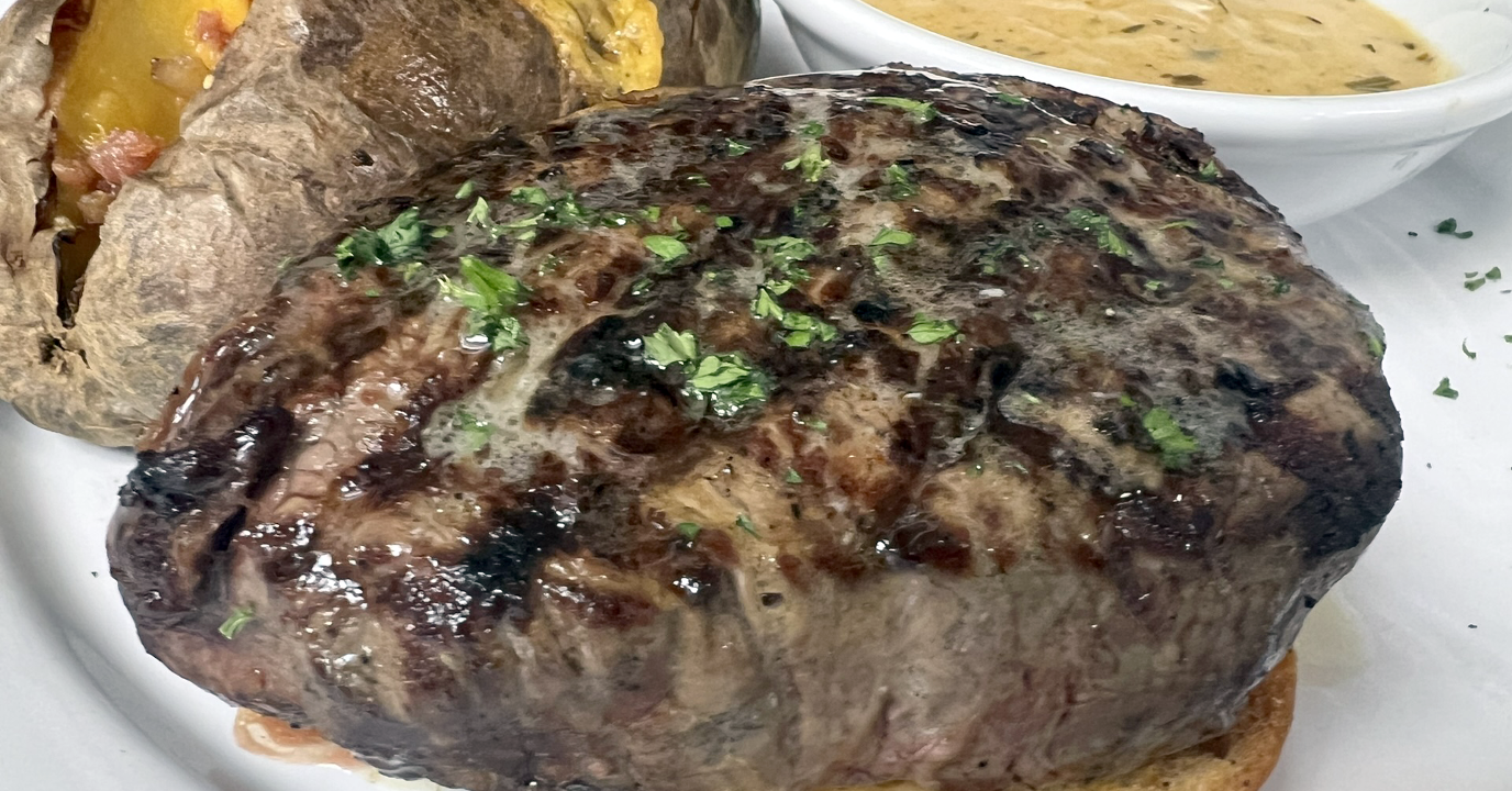 The area's greatest prime rib, slow roasted for eight hours, with housemade au jus, choice of salad, choice of side dish and horseradish sauce.