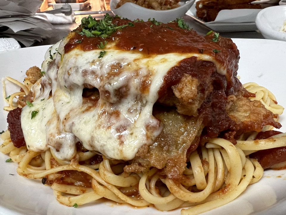 Thin layers of fried eggplant, baked in the oven with house marinara and provolone cheese, served over linguine (or with another side dish)