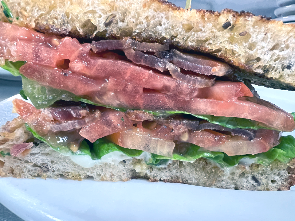 Double-stacked BLT with crisp bacon, ripe tomatoes, and Romaine lettuce on grilled multigrain bread with mayonnaise. Served with choice of side dish.