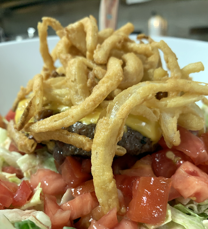 Chopped Romaine and diced tomatoes, tossed in our housemade Thousand Island dressing, topped with a freshly grilled cheeseburger and onion straws.